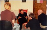 work during an informal talk between clinics. |